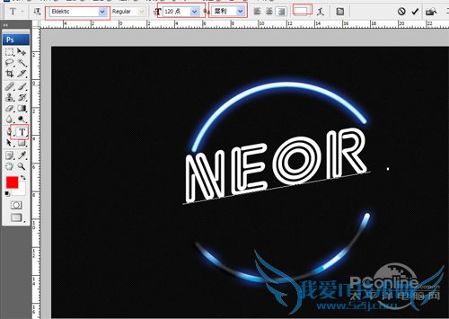 19、在工具箱中选择横排文字工具 ,在画面中用鼠标单击后,出现一个输入文字光标,在光标后输入“neor”,在工具选项栏中设置字体为“Eklektic”,设置字体大小为“120点”,设置消除锯齿为“犀利”,设置字体颜色为白色,如图19所示。