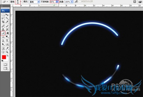 18、在图层样板中选择图层2,复制一个图层2副本,接着在工具栏中选择橡皮擦工具,设置不透明度的值都不同,在工作区域擦不同位置,调整后的效果图,如图18所示。