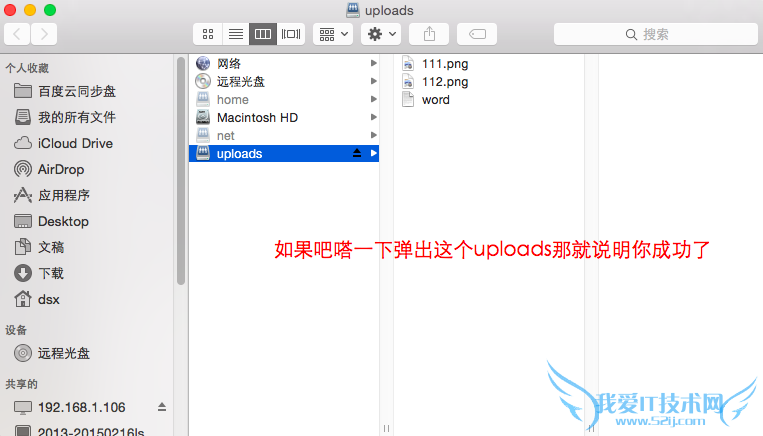 然后点开Finder --> 前往 -->连接服务器 -->里面输入 http://192.168.1.106/uploads (这个是举例,你要输入你自己的ip地址)