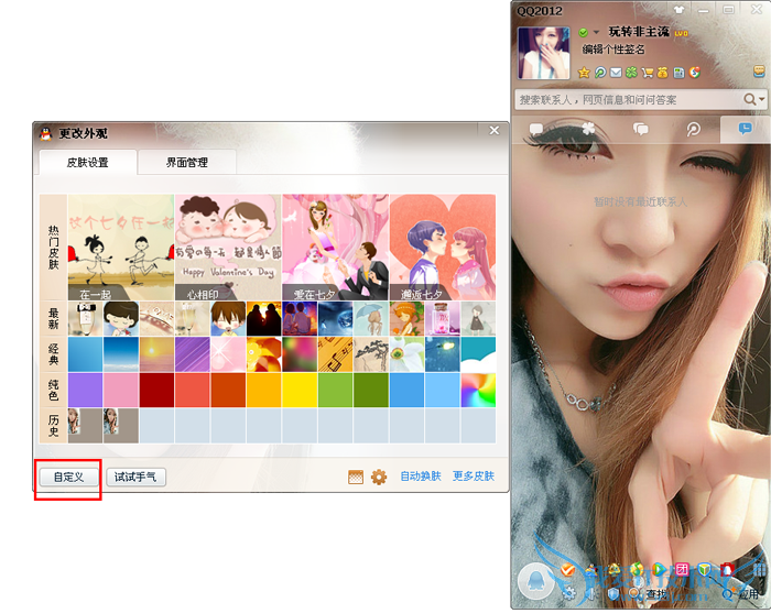 答:点击QQ头像,然后跳出来个人资料卡,在资料卡的右上角,有一个衣服的图案 ,鼠标点在这里,就可以出来选皮肤的地方了,然后选喜欢的皮肤进行设置 >>详细