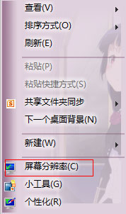 既然写了就写的完整一点,再介绍一下显示器分辨率调整方法,以Windows 7操作系统为例,在桌面空白处,点击鼠标右键,在弹出菜单中选择“屏幕分辨率”。