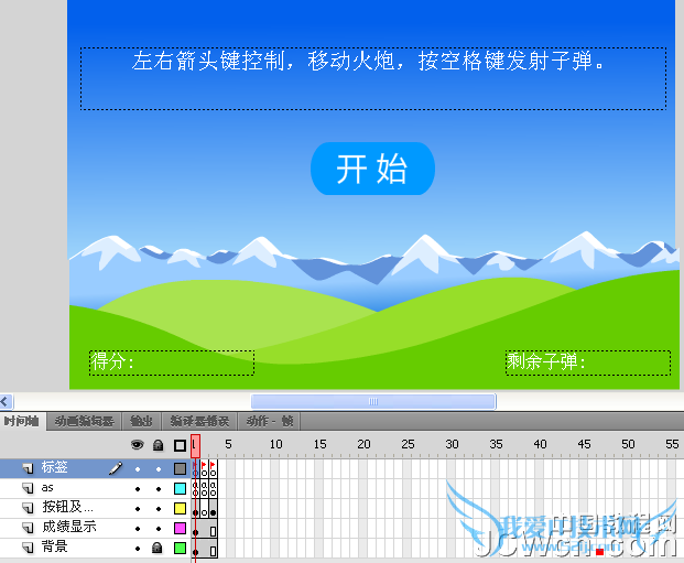2、成绩显示层:"得分:" 动态文本:实例名 showScore "剩余子弹:" 动态文本:实例名 showShots。