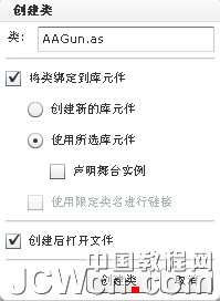 创建类的方法同第3步。首先选中库中的AAGun元件,打开项目面板创建类。在"将类邦定到库元件"前面打勾,点下"使用所选库元件"的单选按钮。图:邦定库元件