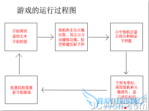 这款游戏可能大家都玩过。敌机在蓝天上来回飞行,左右箭头键控制火炮在草地上左右移动。按下空格键发射子弹,击中敌机后,敌机爆炸。得分:记录击中的敌机数。剩余子弹:记录子弹的数量。