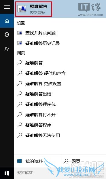 1、在Cortana搜索栏输入“疑难解答”,选择第一项