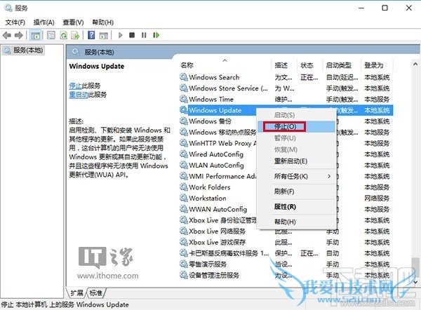 2、找到Windows Update服务,并将其停止(可在服务名称上点右键,选择“停止”;或点击左侧的“停止此服务”)
