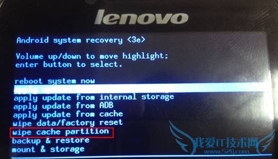 3. 使用音量加减键选择至“wipe cache partition”,按电源键确认;