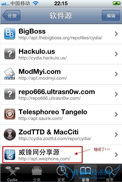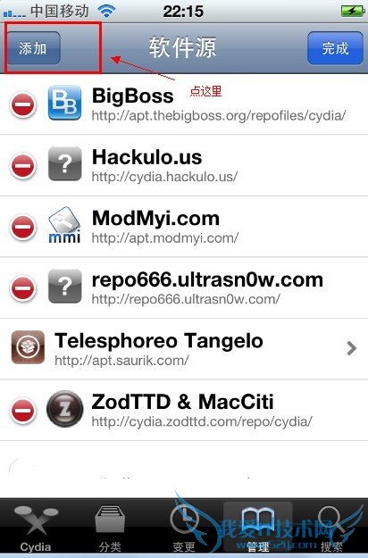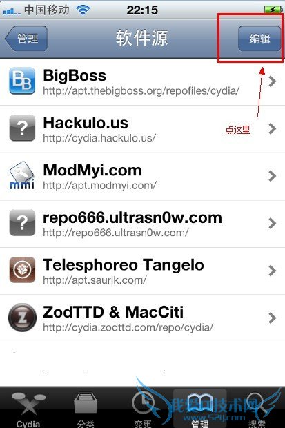 点击cydia,进入管理。是否中文界面无所谓,按照位置一路点下去也可以。