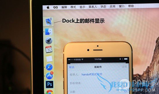 为了验证Handoff已经能够正常使用,我在iPhone6 Plus上登陆了邮件进行测试,当我在手机上新建一封邮件后,又最小化到后台运行,这个时候,我终于看到我的MBP上的Dock栏上新增了一栏显示Handoff连接的邮件应用:“邮件——来自**的iPhone”。