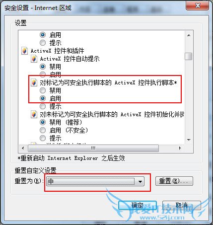 之后在internet属性上切换到“安全”选项卡上,点击最下面的“自定义级别”按钮,然后将“对标记为可安全执行脚本的ActiveX控件执行脚本”选项上设置为“启用”。设置完成后即可。如下图所示:
