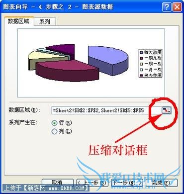 第三步,在“图表向导-4 步骤之1-图表源数据”对话框(图3)上,如果需要更改源数据(区域),则单击“数据区域”框右端的“压缩对话框” 按钮,临时移除对话框,以便于在工作表中通过选择单元格来输入区域。完成后,可再次单击该按钮显示完整对话框。最后单击“下一步”。