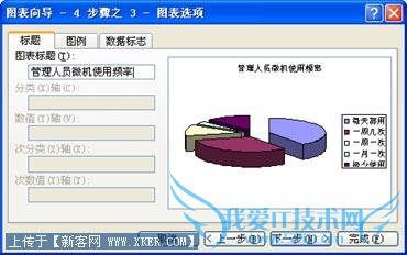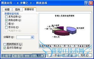 第四步,在“图表向导-4 步骤之1-附表选项”对话框(图4)上,“标题”选项卡的“图表标题”框中键入图表标题;“图例”选项卡上,“位置”单选按钮组中,选中“底部”,将图例放置在底部;“数据标志”选项卡(图5)上,选中“类别名称”复选框,然后,单击“下一步”。
