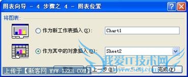第五步,在“图表向导-4 步骤之1-图表位置”对话框(图6)上,选择将图表“作为其中的对象插入”原工作表,或“作为新工作表插入”(插入到一张新建的工作表中),单击“下一步”。