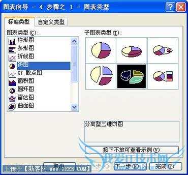 第二步,在“图表向导-4 步骤之1-图表类型”对话框(图2)上,“标准类型”框中,选定所需类型(如饼图)后,再选定 “子图表类型”,然后单击“下一步”。