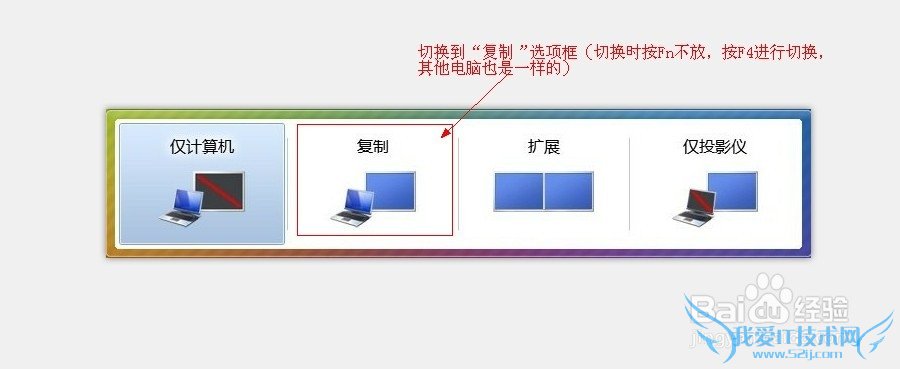 我就简单的以其中一种来做演示,这个是惠普的牌子的,连接好之后按Fn+F4进行切换,切换到“复制”选项框,就可以看见投影上的画面和笔记本上的画面是同步的,其他几个选项均达不到这个要求,如下图