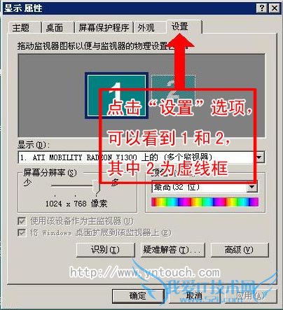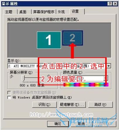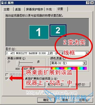 把“将windows桌面扩展到该监视器上勾选中,此时2显示器变为实线框,如(图4)。此时你可以对2显示器进行屏幕分辨率和颜色质量的相应设置。