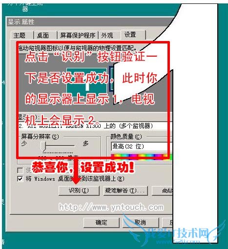 为了确认我们是否设置成功。你可以点击“识别”按钮,此时你的电脑显示器上会显示一个大的白色的1,而你的电视机(打开电源的电视机并且连接上显卡的视频输出)上会显示一个大的白色的2,说明你设置成功。