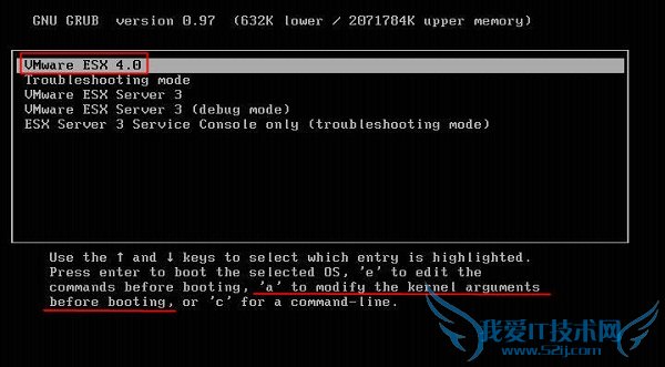 第二步:到 GRUB 菜单处 ,用键盘上下键,将光标放在“VMware ESX 4.0”上,按“a”键,进入 GRUB 编辑界面