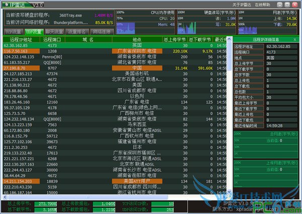 IP雷达原本是用来查看本地机器程序使用网络状态的工具软件,能够查看到每个进程连接ip地址的详细信息,包括远程IP的流量,及其域名、物理位置等等,本文的核心思想是通过IP雷达找到各类BT软件用的资源服务器,在路由器或者防火墙上封杀这些网址。