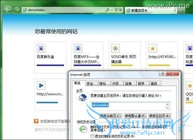 其实在新版IE9中,已经有了一个类似于九宫格的“您最常使用的网站”,这里所列示的都是浏览器自动记录的网页访问列表,而将它设为IE9的起始页也并不难,只要打开Internet选项,将其中的“常规”→“主页”修改为“about:tabs”即可。