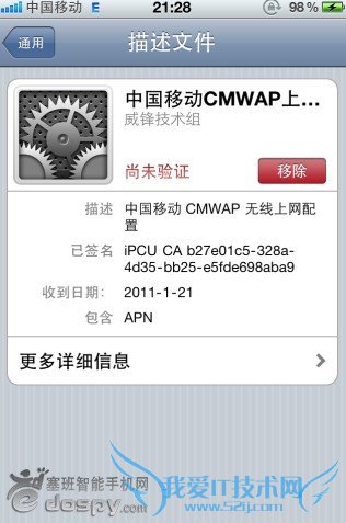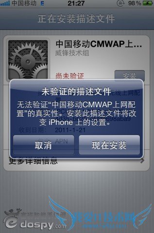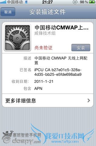 点击安装CMWAP配置描述文件,返回通用会发现多了一个描述性文件,打开网络蜂窝数据网会发现APN变成CMWAP了