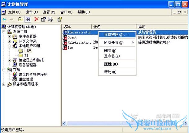 4、在出现的窗口,左边点“本地用户和组”,点“用户”,在右边窗口会出现所有用户,用鼠标右键点用户名,在出现的菜单中选择“设置密码”。