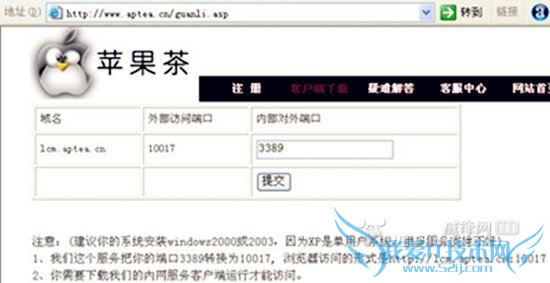 首先去 “苹果茶网站 ”申请一个域名,申请后该服务会分配一个外网端口给你,这个端口就对应了你内网电脑的一个端口,以后访问这个域名的端口时,就等于访问了你内网电脑的端口了。等于是给你做了一个端口映射。