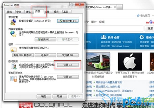 选择“内容”标签,在自动完成项目中点击“设置”。