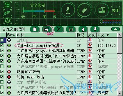 1. 打开“天网”主界面(如图1),单击“自定义IP规则”,在“自定义IP规则”窗口(如图2)中,选定“防止别人用命令探测”项,然后单击[修改]按钮,进入“IP规则修改”窗口。