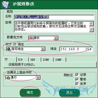 2. 在“IP规则修改”窗口(如图3)的“对方地址栏”中选定“指定地址”(默认是“任何地址”)并输入“中教育星”的IP地址;在“当满足上面条件时”栏中选择“通行”,然后单击[确定]回到主界面。