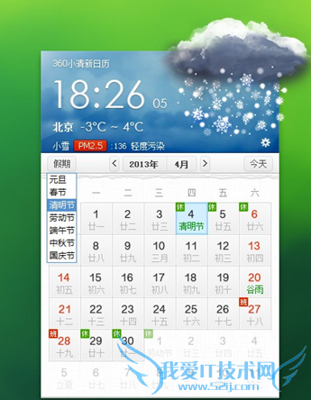 这时我们再点击电脑屏幕右下角的时间就可以自动打开360日历了,小清新风格的日历皮肤绝对会让你眼前一亮,还可以通过设置城市来查看全国各地区的天气情况及空气质量。同时,360还提供了很多套不同的背景图片和天气图标,会随不同的日期及天气情况变化。