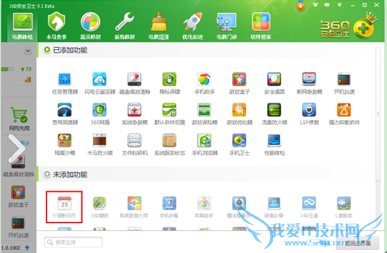 答:朋友好!在安全卫士主界面右侧——功能大全——点击更多进入(如下图所示)点击未添加功能——添加“小清新日历\”即可使用(如下图所示9.7版本)如果没有就在“未添加功能\”左下角——“搜索应用中\”输入“小清新日历\”搜索试试看 >>详细