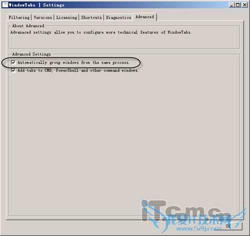 对于一些类似的窗口,如QQ聊天窗口,word文档窗口等,我们还可以让它进行自动整合成多标签。在系统托盘处右击WindowTabs来选择“sittings”,在弹出的窗口中点击“Advanced”标签,把下面的“Atuomatically group windows from the same process”选中,再点击“OK”按钮即可(如图2)。