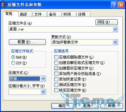 步骤1,首先选中需要合并的多个TXT文档,然后单击鼠标右键,在弹出的菜单中选中“Win-RAR—添加到压缩文件”命令,这时会出现“压缩文件名和参数”窗口,在“常规”标签页中对压缩文件进行命名,并将“压缩方式”下拉框中的“存储”一项选中,点击“确定”按钮退出;