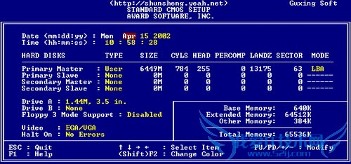 下面是硬盘情况设置,列表中存在PRIMARYMASTER第一组IDE主设备;PRIMARYSLAVE第一组IDE从设备;SECONDARYMASTER第二组IDE主设备;SECONDARYSLAVE第二组IDE从设备。这里的IDE设备包括了IDE硬盘和IDE光驱,第一、第二组设备是指主板上的第一、第二根IDE数据线,一般来说靠近芯片的是第一组IDE设备,而主设备、从设备是指在一条IDE数据线上接的两个设备,大家知道每根数据线上可以接两个不同的设备,主、从设备可以通过硬盘或者光驱的后部跳线来调整。