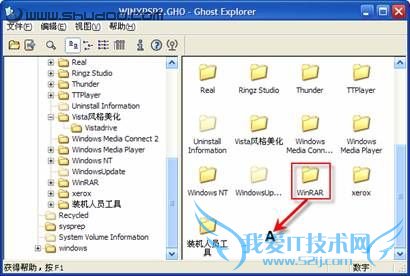 第1步:先运行“Ghost映像浏览器.exe”,然后打开Ghost映像(如E盘根目录下的WINXPSP2.GHO),然后右击“Program Files”目录下的“WinRAR”文件夹,选择“删除”,删除这个文件夹(图1)。