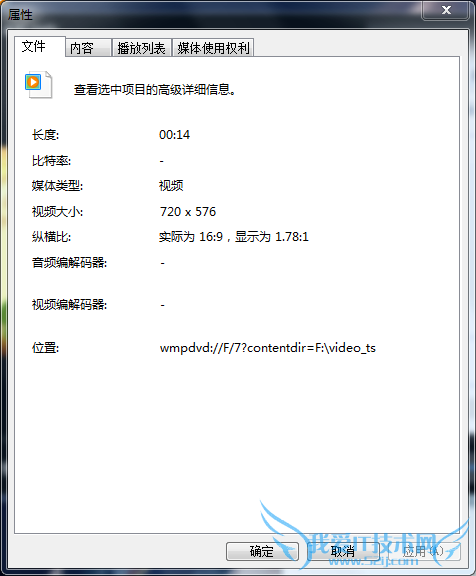 放入光盘,自动会启动Windows media player软件播放,这是后,点击菜单中的“文件”下面的“属性”,可以看到下面这个面板。特别是位置的那部分,暴露了视频的路径:“F:\video_te”。对,视频就在这个目录。