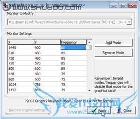 对于一些较老的液晶显示器或杂牌LCD显示器,用户遇到类似的故障问题时,而又找不到显示器驱动,那么就无缘使用Vista系统了,其实解决的方法还是有的,例如使用Refreshforce工具(下载地址:http://www.shudoo.com/bzsoft)自定义屏幕刷新率,运行软件后点“Add Mode”按钮,然后将“Freguency”刷新率设置为60或更高(图2),并设置好显示分辨率(X为宽度,Y为高度),点“Apply”按钮即可生效,但这样只针对游戏及软件运行窗口有效,无法解决液晶屏幕的闪烁故障。