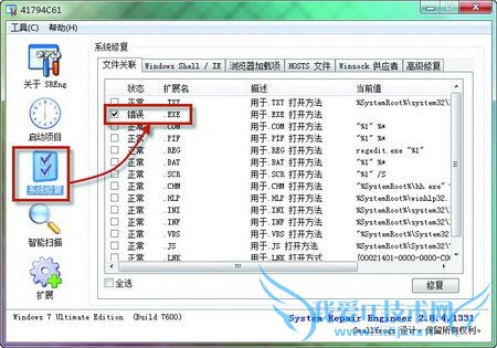 先在本站下载“sreng”,然后将下载的ZIP格式压缩包解压到桌面并将解压得到的唯一一个EXE件的扩展名修改为“cmd”,再双击运行之,其界面如图2所示;最后勾选图2中与“.EXE”所对应的复选框并单击“修复”按钮就可以了。