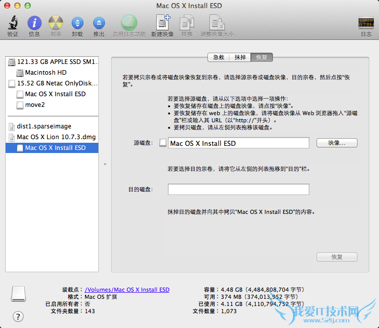 双击左侧磁盘列表中的Mac OS X Lion 10.7.3.dmg,会弹出新的Finder窗口并在磁盘工具左侧的列表中加载出一个Mac OS X Install ESD 分区。弹出的Finder窗口可以关闭,不用理会。