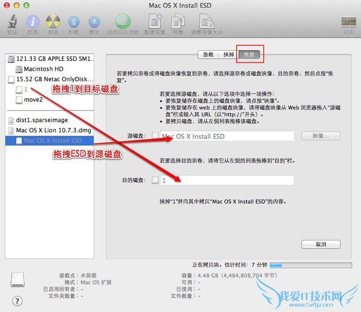 选中Mac OS X Install ESD 分区,由右侧点击 恢复 标签项。确认Mac OS X Install ESD 分区在源磁盘位置,拖拽U盘分区1到目标磁盘。确认无误后点击 恢复。
