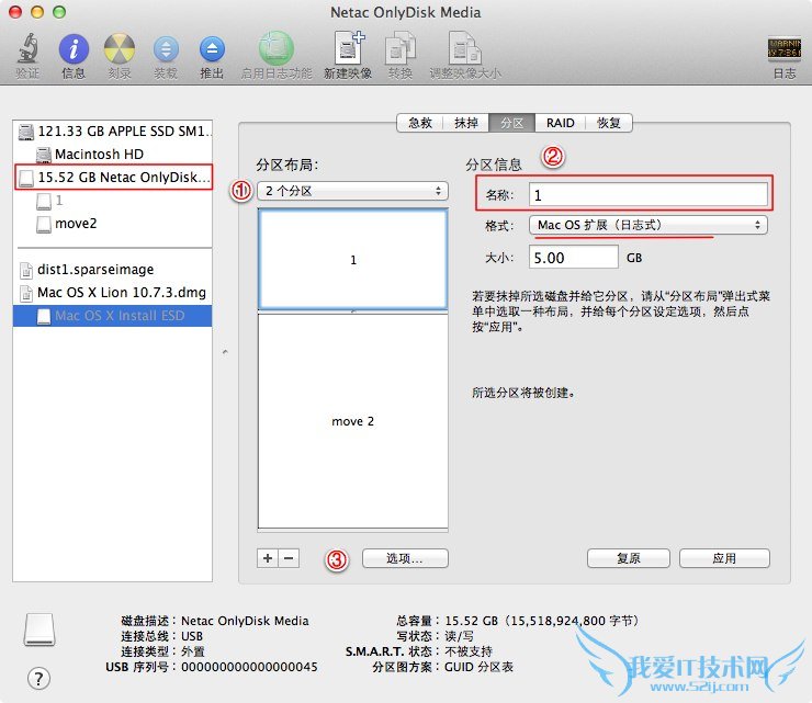 选中16G的U盘,左侧选择 分区 项,①分区布局中选择 2个分区 ,并给2个分区命名,例如:这里我命名第一个分区为:1,第二个分区为:move2。
