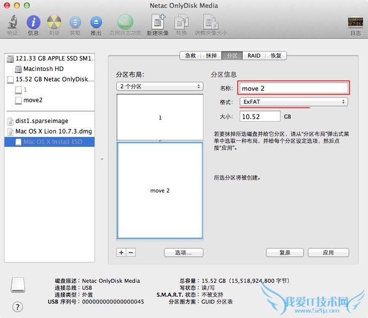 设定第二个分区 move2,注意:这里分区格式选择为 ExFAT,这样可以在Win系统中也能识别这个分区。