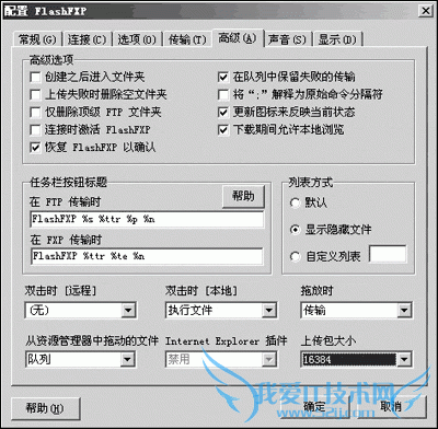 一、提高FlashFXP的上传速度选择“选项→参数选择”菜单打开“配置FlashFXP”窗口,切换到“高级”标签,这里有个“上传包大小”的设置项。上传包的大小很大程度上决定了FlashFXP的上传速度。其默认值为“4096”(单位为字节),我们可以将其数值设置得大一些,如图1所示。如果你还觉得对速度不满意,那就打开FlashFXP安装目录下的“Flashfxp.ini”文件,在“Main”字段你可以看到一行“UTB=*”的代码,这段代码同样用于定义上传包大小,其具体换算关系为:“上传包大小=2^(UTB-1)”,这样我们可以无限制设置包的大小了。