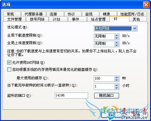 答:因为BT下载的原理就是边下载边上传,一边从别人的电脑中下载你需要的文件,同时也需要将自己电脑中已经下载的文件上传给别人。在FlashGet中只能将下载完毕 后继续上传的时间设置得小些,并不能设置成下载完毕后立即终止上传,除非直接关闭FlashGet。设置方法:打开设置窗口,再选择“BT”选项卡,接下来再将“当下载完毕做种的时间”设置成1(不能设置成0,0代表一直提供上传)。(见图1)