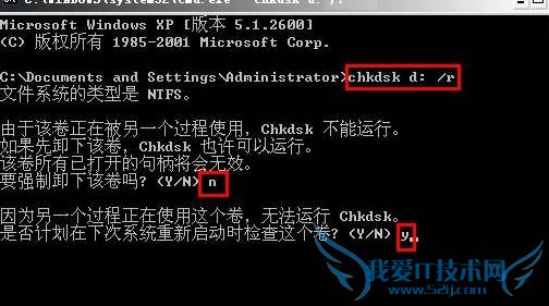 由于怀疑是硬盘方面的问题,我先用软件检测了一下,结论是没有坏道。接着点击“开始”→“运行”,输入“cmd”,回车,打开命令提示符窗口。然后是对硬盘的扫描,由于d电脑发生故障时所运行的程序均来自于C、D、E三个分区,因此我分别输入了“chkdsk x: /r”(其中X代表盘符,笔者需要扫描三个分区,因此X分别代表C、D和E)回车。在接下来会连续弹出两次询问选项,分别选择“N”和“Y”(如图),重启电脑。