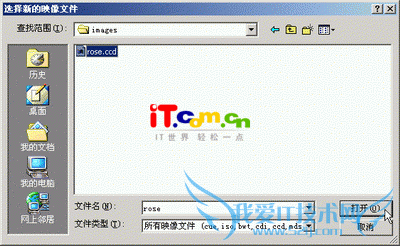 按照图5所示操作,选择安装镜像文件,然后会弹出一个窗口,让你选择镜像文件,选择好镜像文件,按一下打开按钮。(图6)