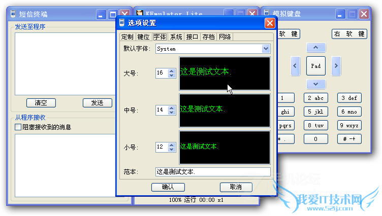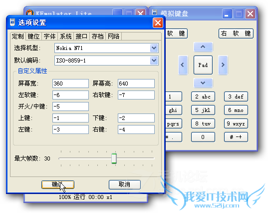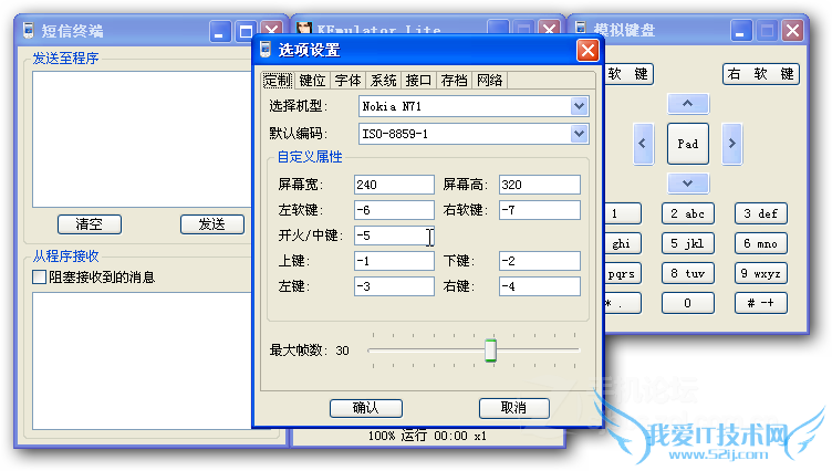 ke模拟器默认的机型是Nokia N71,非触屏,240*320分辨率,可以在“视图”-“选项”-“定制”里面查看和修改,由于ke模拟器能设置的东西比较多,所以我多截了几个图: