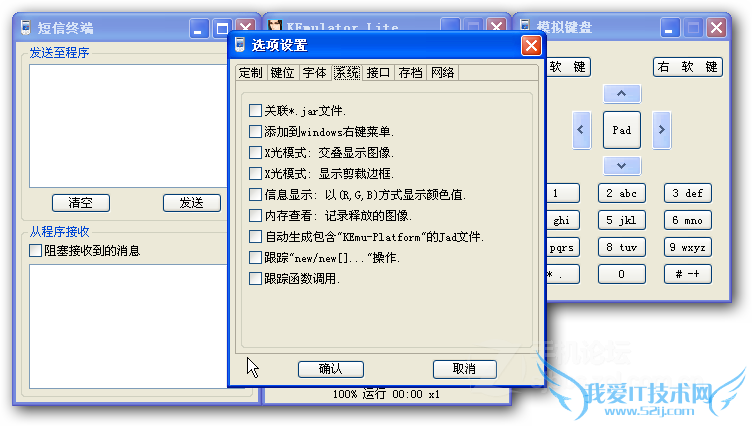 选项——系统:建议勾上最上面两个,这样的话,双击jar文件,就可以直接调用ke模拟器打开了。“信息显示”一项是屏幕取色,这个在改软的时候很有用。