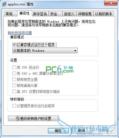 只要在 apploc.msi 上按右键选定”属性” ,进入”兼容性” 的标签页选择”先前的Windows 版本”即可而且也只有一个选项。